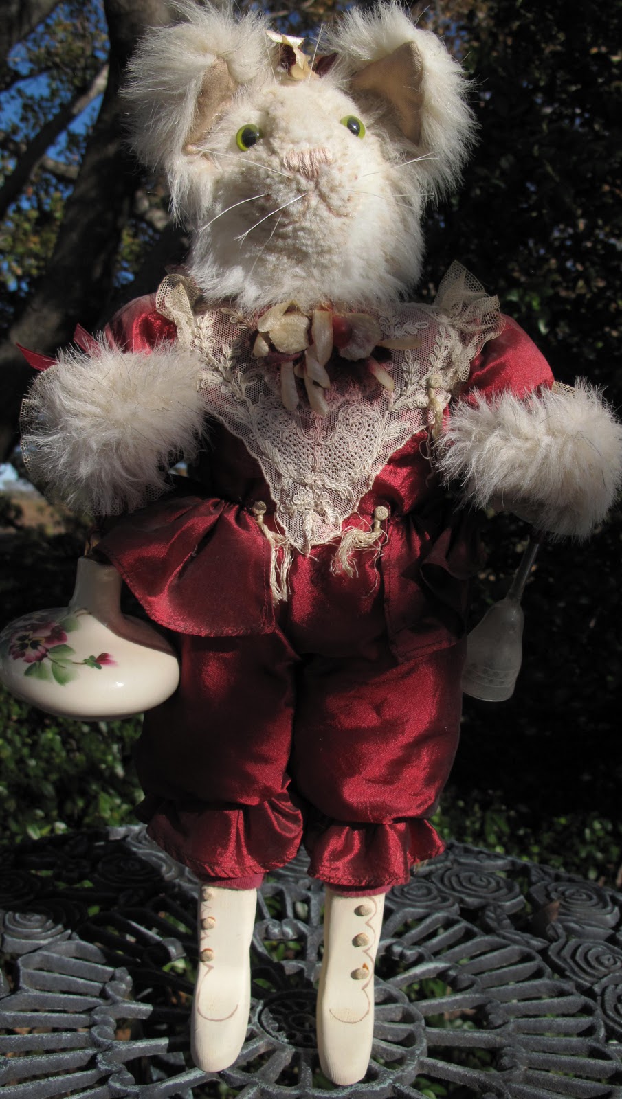 Artist Cat--wooden body, antique vase and lace trimming on outfit. $65