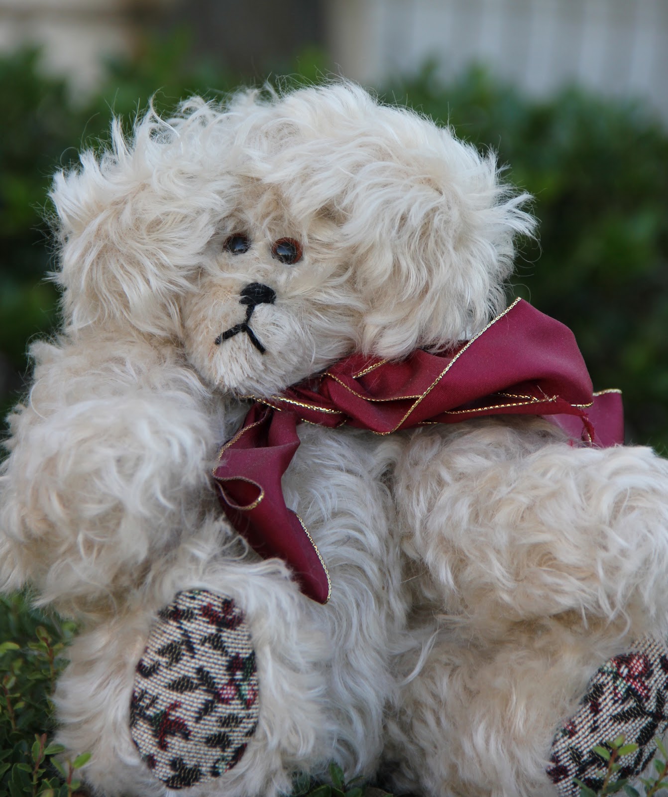 10 1/2" Mohair bear with tapestry paws. Ivory String Mohair from England. Fully jointed, fiberfill stuffing. (3 left)