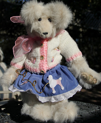 Suzie is a 15" tall, original bear with white plush fur, tapestry paws, a felt poodle skirt and pink knit sweater dressed